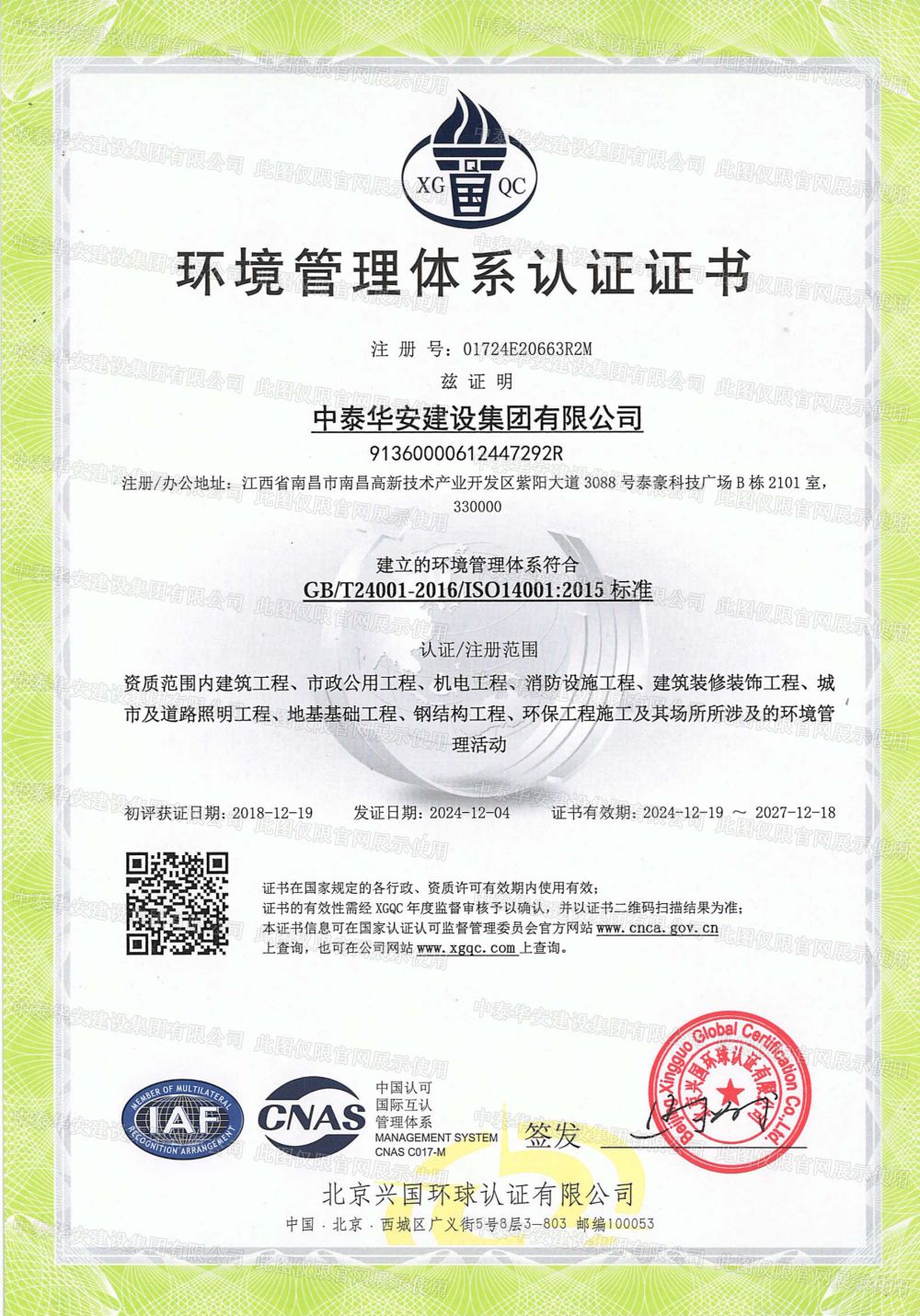 >环境管理体系认证证书