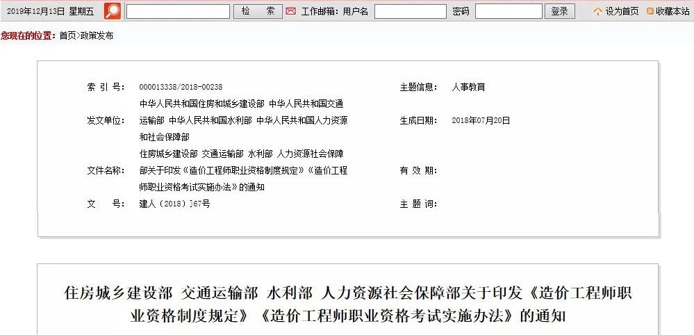 住房和城乡建设部、交通运输部、水利部、人力资源社会保障部于2018年印发《造价工程师职业资格制度规定》《造价工程师职业资格考试办法》的通知。明确:造价工程师分为一级造价工程师和二级造价工程师
