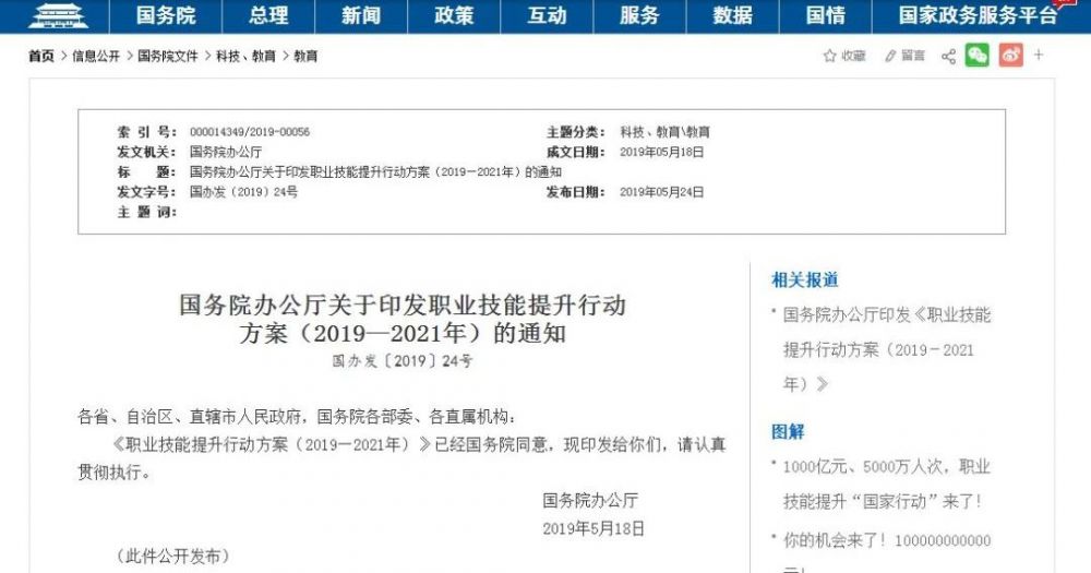 5月24日,国务院印发《职业技能提升行动方案(2019—2021年)》。