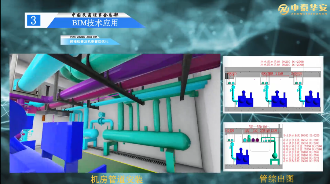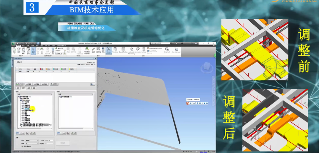 利用BIM软件的碰撞检查功能,对各专业模型进行碰撞检查,并导出碰撞报告,然后对碰撞点进行管综优化和净高分析,并用优化后的模型指导现场施工,减少返工,节约成本。