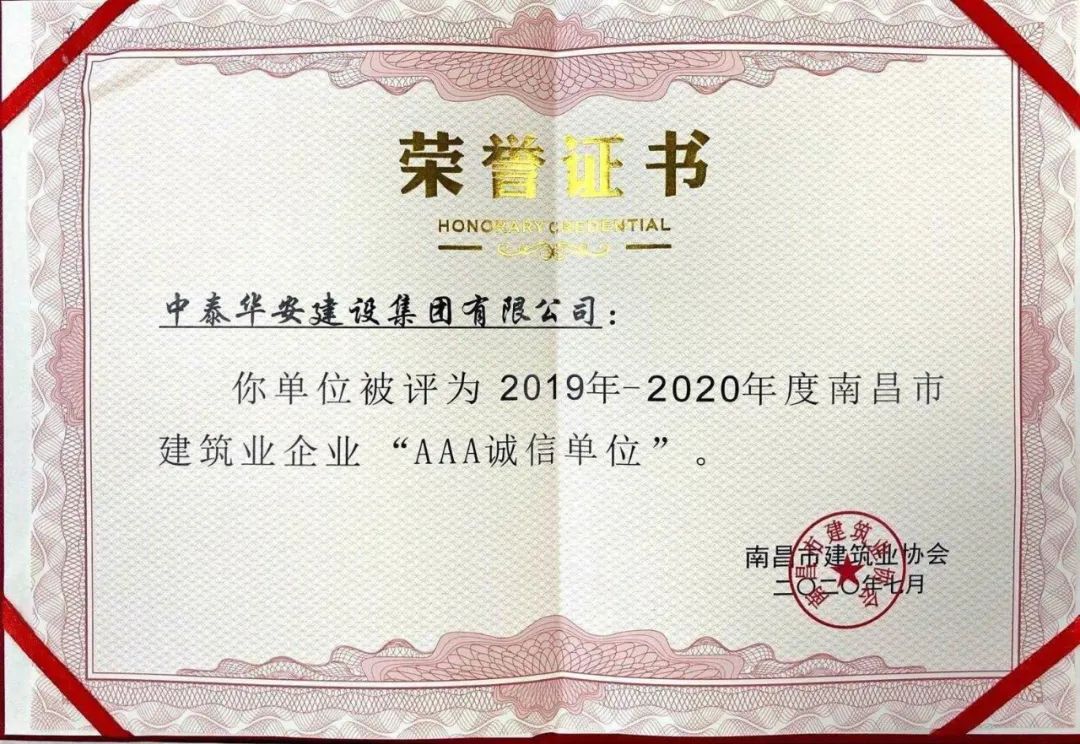 我司在南昌市建筑企业诚信单位评选中脱颖而出,被评为“AAA诚信单位”,这彰显了九游网页版登录入口在企业管理创新、企业诚信建设等方面取得的成绩获得了建筑行业及企业同仁的高度认可。