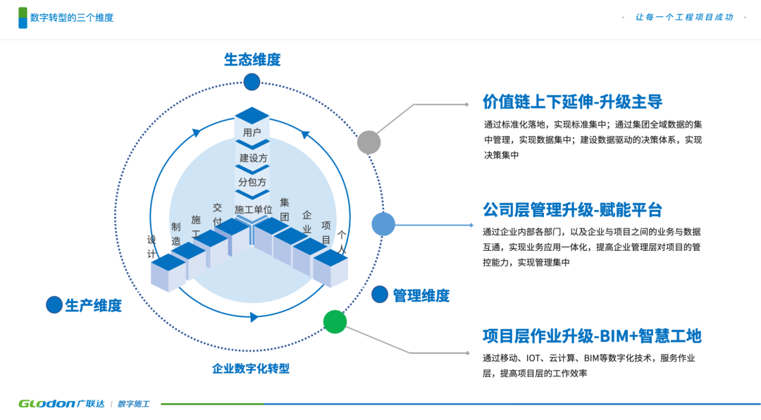 通过前两个维度,我们将建筑物数字化了,建造过程数字化了,同时我们将内部企业管理数字化了,将人和工作也数字化了。