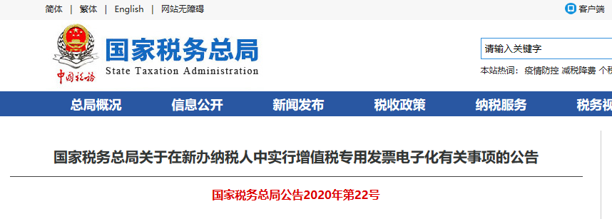 为全面落实《优化营商环境条例》,深化税收领域“放管服”改革,加大推广使用电子发票的力度,国家税务总局决定在前期宁波、石家庄和杭州等3个地区试点的基础上,在全国新设立登记的纳税人(以下简称“新办纳税人”)中实行增值税专用发票电子化(以下简称“专票电子化”)。现将有关事项公告如下: