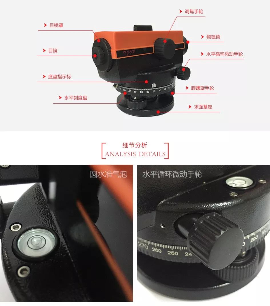 3)伸缩三脚架腿长整平圆水准器