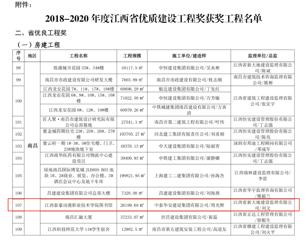 >喜讯!由我司承建的江西泰豪动漫职业技术学院图书馆荣获2018-2020年度江西省优良工程奖
