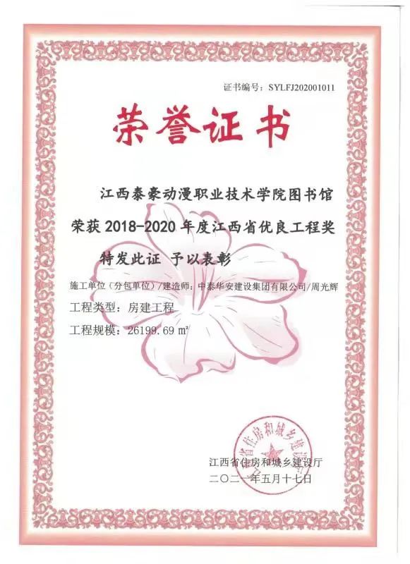 喜讯!由我司承建的江西泰豪动漫职业技术学院图书馆荣获2018-2020年度江西省优良工程奖