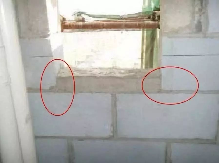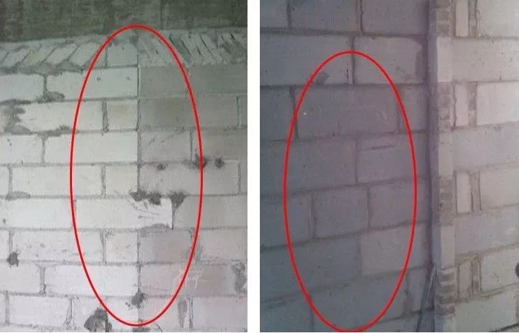 混水墙面组砌方法混乱,出现通缝和“二层皮”,组砌形式不当,形成竖缝宽窄不均
