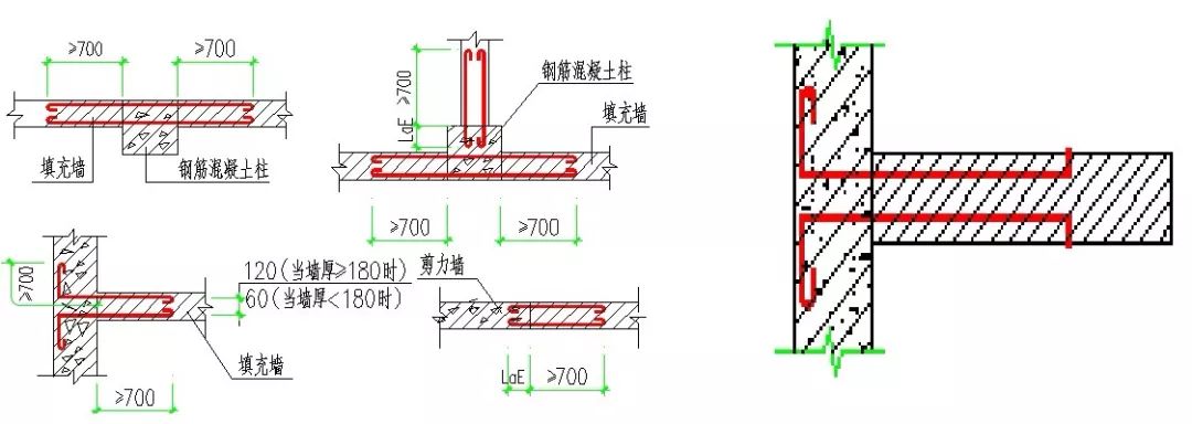 中南地区工程建设标准设计:混凝土墙、柱、构造柱与隔墙之间均应用钢筋连结,沿高度每隔500设2Ф6,钢筋伸入填充墙长度不宜小于700,锚入混凝土墙、柱内200。