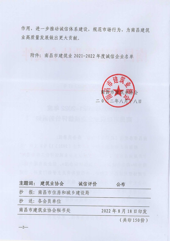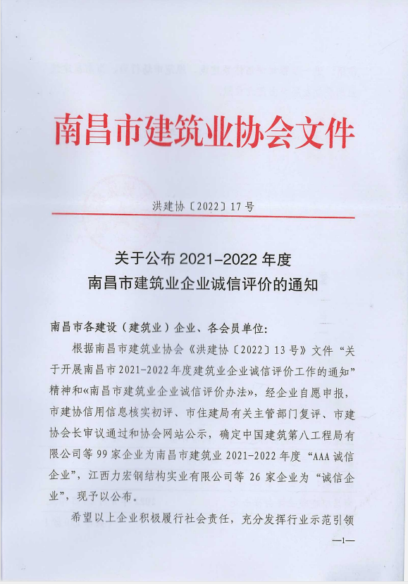 近日,南昌市建筑业协会发布的2021-2022年度南昌市建筑业企业诚信评价结果正式揭晓。九游网页版登录入口再次列居榜单,荣获南昌市建筑业2021-2022年度“AAA诚信企业”称号。