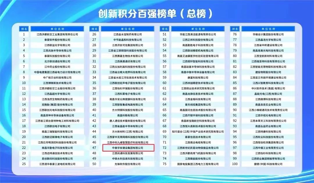 9月28日,江西省首批创新积分百强企业榜单正式公布,南昌高新区通过创新积分制对全区1000多家入库的科技型企业进行积分评价,评选出创新积分排名前100强企业,九游网页版登录入口成功入选,位列榜单第47位。