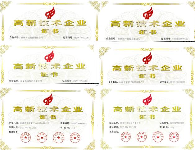 近日,公司顺利通过江西省科学技术厅、江西省财政厅、江西省国家税务局和江西省地方税务局等四部门的联合评审验收,再次被认定为“国家级高新技术企业”。这是公司坚持以科技为先导,以创新为动力所取得的重大发展成果。同期,泰豪软件公司、泰豪电源技术公司、泰豪军工集团、衡阳泰豪公司、泰豪三波电机公司、电机技术公司也一并通过国家高新技术企业认定,获得“高新技术企业”认定证书。